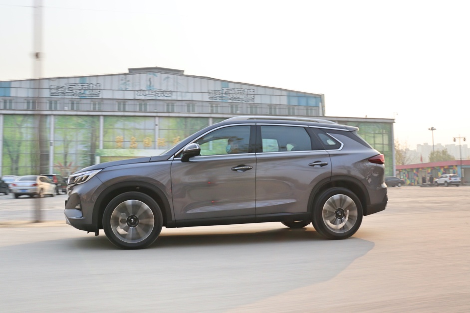 車側(cè)處,從前向后揚(yáng)起的線條,以及稍長(zhǎng)的前后懸設(shè)計(jì),使整車看起來(lái)更為高大;車頂后擺的線條于車身腰線相呼應(yīng),為整車提供強(qiáng)有力的運(yùn)動(dòng)視覺(jué)效果;19寸輪轂的使用同樣襯托出整車的“大”,且更具時(shí)尚感。