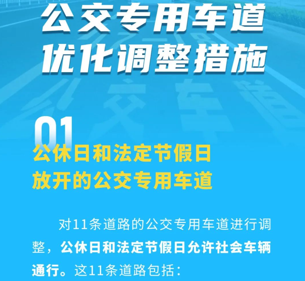 此次優化調整主要集中在三個方面:一是公休日和法定節假日放開部分道路公交專用車道;二是允許經政府相關部門核定的單位通勤班車、校車等集約化通勤大客車按規定使用公交專用車道;三是優化部分道路公交專用車道啟用時間。