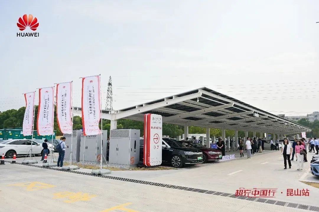 新超充站位于蘇州昆山南站P3停車場,是華為數字能源、朗新科技集團、昆山交發集團及江蘇宏寶集團多方共同打造的全液冷超充項目。可滿足60輛新能源車同時高效充電,滿足昆山南站新能源網約車和私家車的充電需求。
