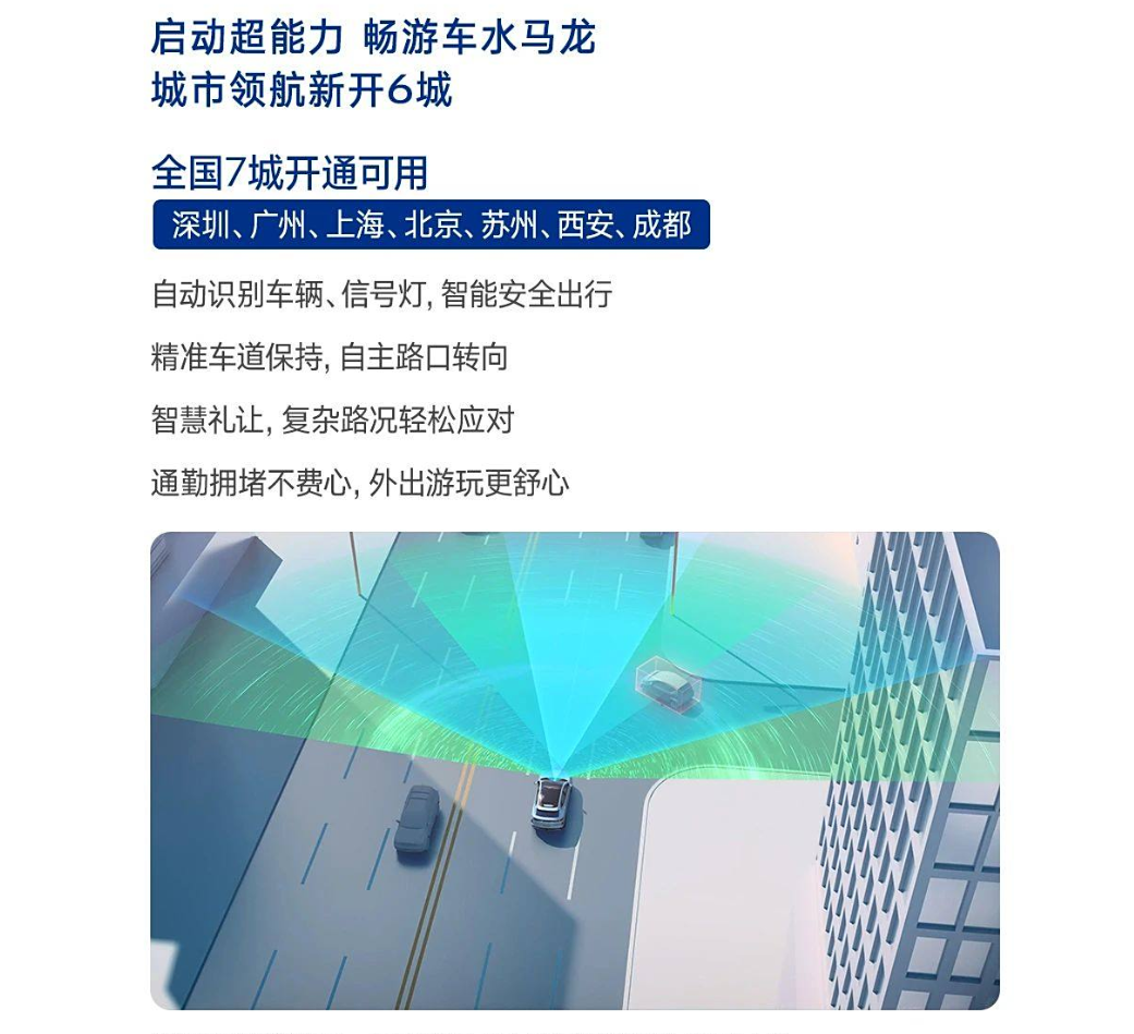 智駕方面,城市領航新增6座城市,目前全國可用的城市已有深圳、廣州、上海、北京、蘇州、西安、成都共7個。該功能可以自動識別車輛、信號燈,完成精準車道保持、自主路口轉向和智慧禮讓等。