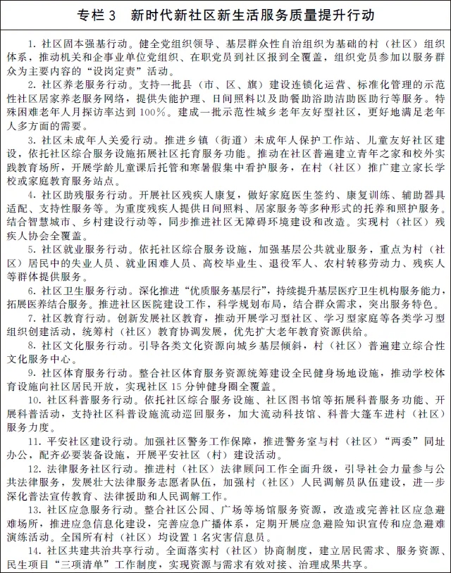 到2025年末,黨建引領(lǐng)社區(qū)服務(wù)體系建設(shè)更加完善,服務(wù)主體和服務(wù)業(yè)態(tài)更加豐富,線上線下服務(wù)機(jī)制更加融合,精準(zhǔn)化、精細(xì)化、智能化水平持續(xù)提升,社區(qū)吸納就業(yè)能力不斷增強(qiáng),基本公共服務(wù)均等化水平明顯提升,人民群眾操心事、煩心事、揪心事更好解決,獲得感、幸福感、安全感不斷增強(qiáng)。