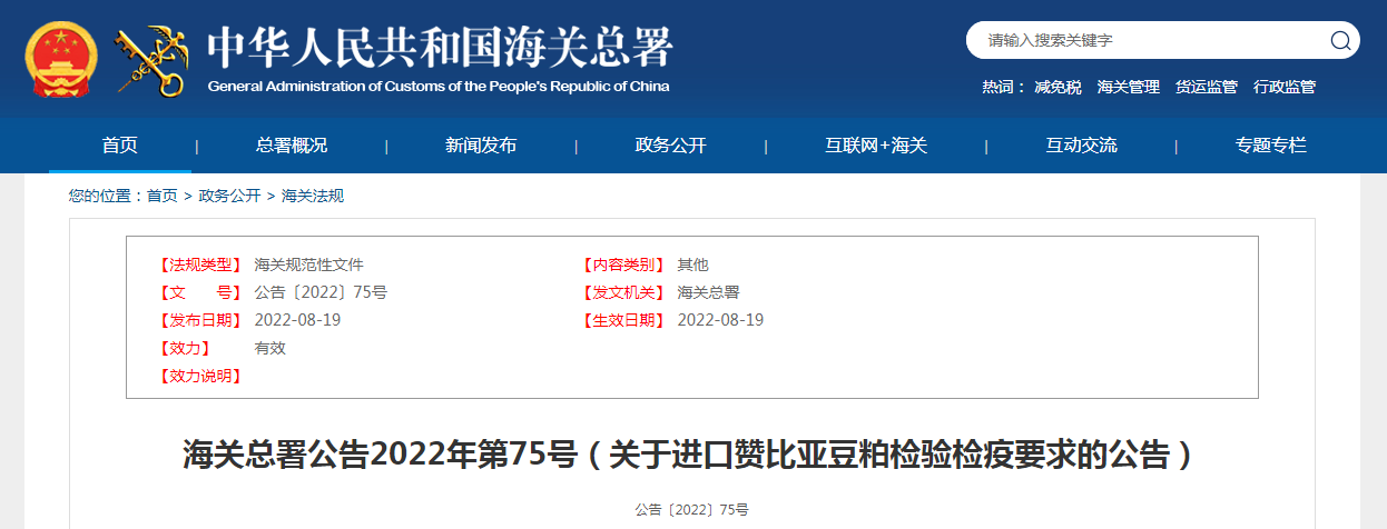 海關(guān)總署公告2022年第75號(hào)(關(guān)于進(jìn)口贊比亞豆粕檢驗(yàn)檢疫要求的公告)