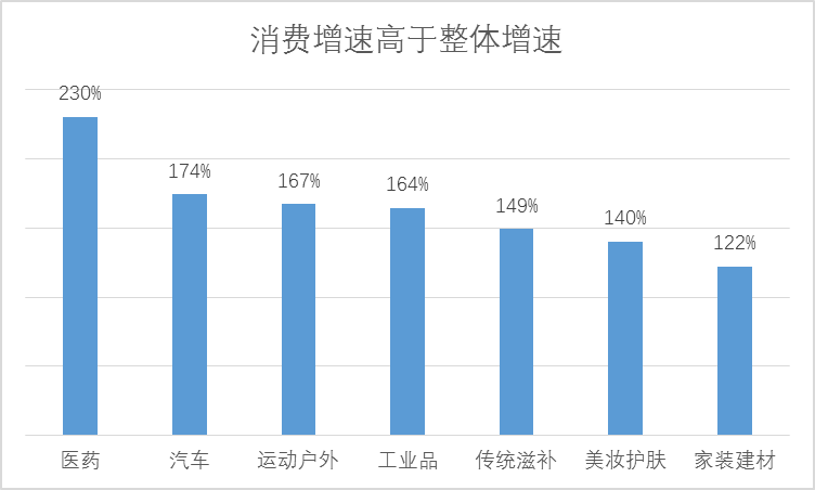 在很多方面,縣域農村的消費增長高于整體,是消費市場增長的主要力量。縣域農村在醫藥的消費增速高于整體增速230%,汽車、運動戶外、傳統滋補、美妝護膚、家裝建材的消費增速高于整體增速100%以上。
