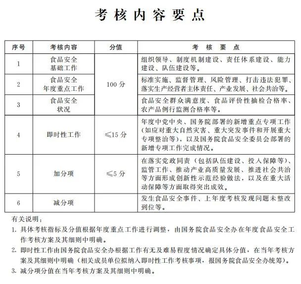 第五條 考核內容主要包括食品安全基礎工作推進、年度重點工作落實、食品安全狀況等,同時設置即時性工作評價和加減分項(考核內容要點見附件)。具體考核指標及分值在年度食品安全工作考核方案及其細則中明確,設置要科學合理,可操作、可評價、可區分,切實減輕基層負擔。