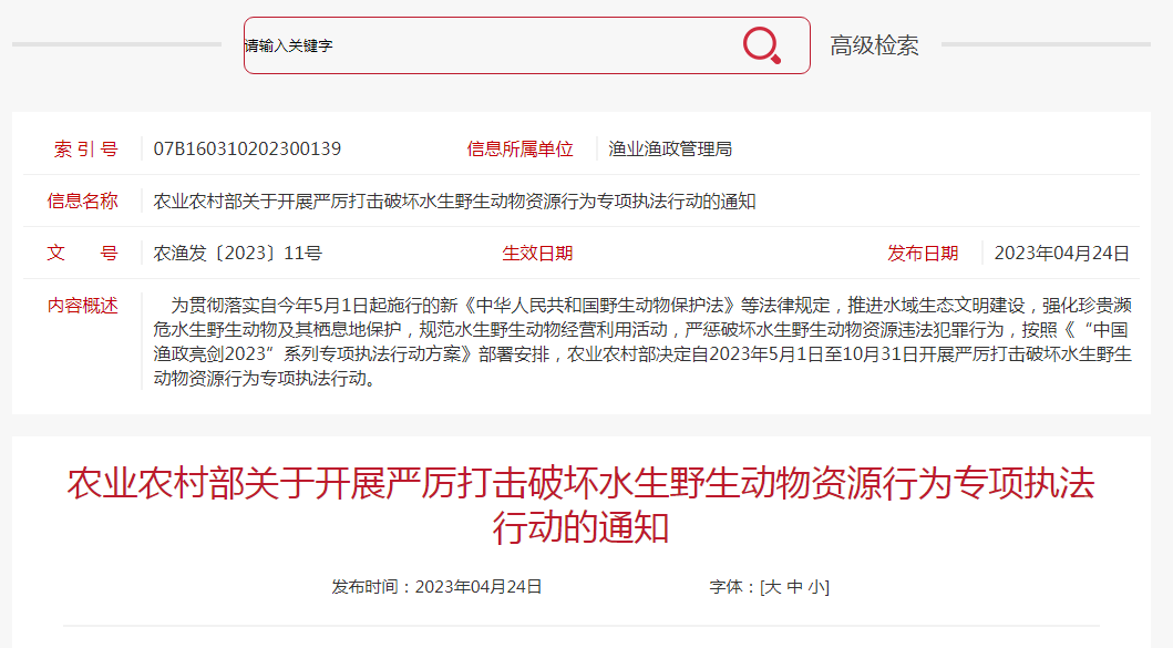 中國質量新聞網訊 據農業農村部網站4月24日消息,為貫徹落實自今年5月1日起施行的新《中華人民共和國野生動物保護法》等法律規定,推進水域生態文明建設,強化珍貴瀕危水生野生動物及其棲息地保護,規范水生野生動物經營利用活動,嚴懲破壞水生野生動物資源違法犯罪行為,按照《“中國漁政亮劍2023”系列專項執法行動方案》部署安排,農業農村部決定自2023年5月1日至10月31日開展嚴厲打擊破壞水生野生動物資源行為專項執法行動(以下簡稱“專項行動”)。