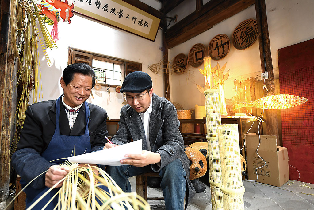 姜鵬(右)和篾匠徐明光交流產品細節。