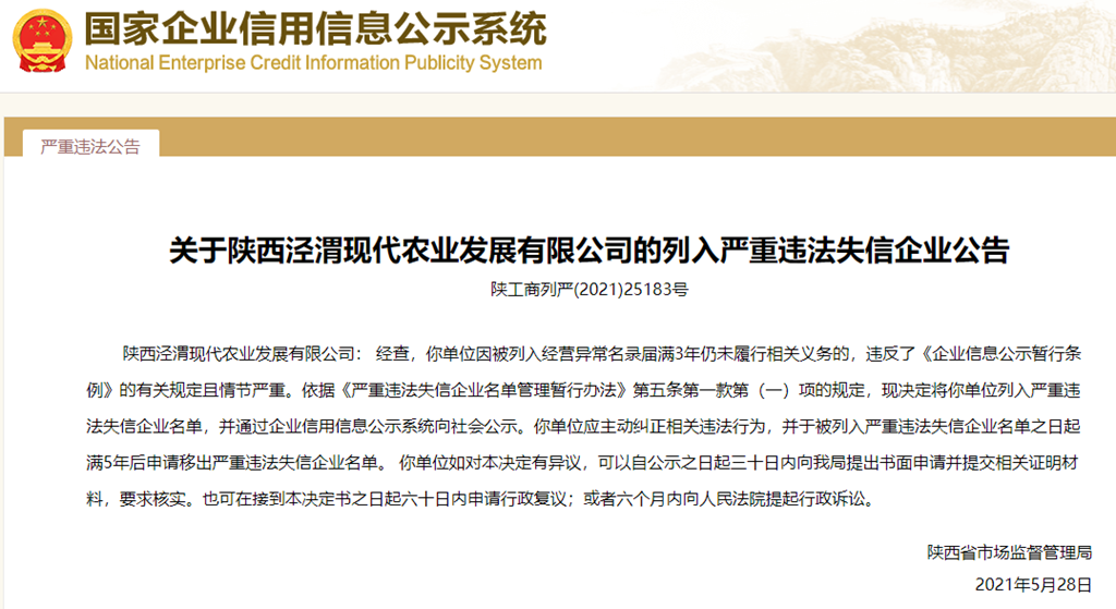 中國(guó)質(zhì)量新聞網(wǎng)訊 從國(guó)家企業(yè)信用信息公示系統(tǒng)獲悉,2021年5月28日,陜西省市場(chǎng)監(jiān)督管理局發(fā)布關(guān)于陜西涇渭現(xiàn)代農(nóng)業(yè)發(fā)展有限公司列入嚴(yán)重違法失信企業(yè)名單的公告(陜工商列嚴(yán)(2021)25183號(hào))。