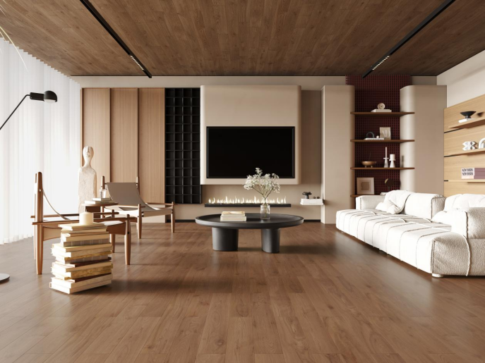 溫潤細膩的微光面層,比啞光面層更具色彩流動感,比亮光地板更雅致,有效提升空間高級質感。