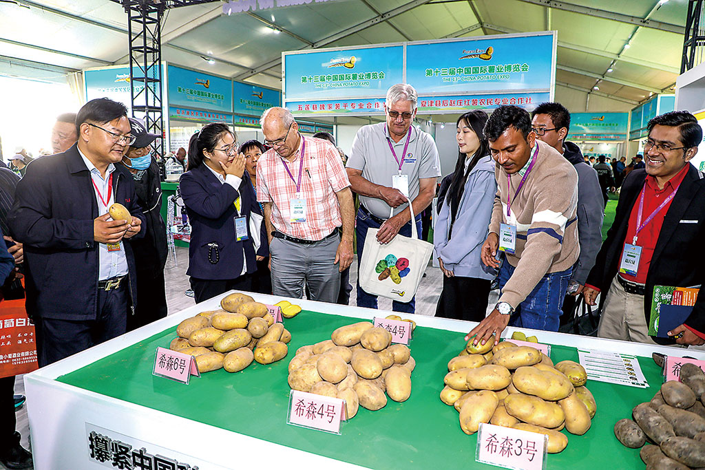 10月23日,第13屆中國國際薯業博覽會在山東省滕州市舉行。此次展會以“大食物、大產業、大平臺”為主題,展示多種薯類產品,吸引眾多國內外客商。圖為國外客商在了解馬鈴薯品種。 范長國 攝