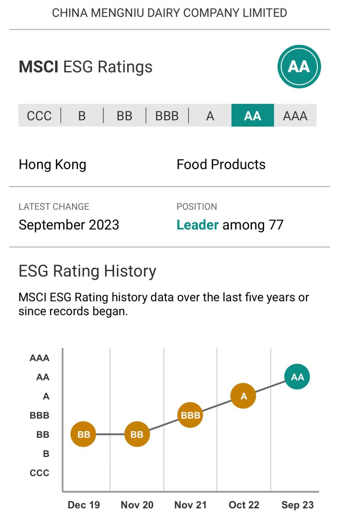 憑借ESG領(lǐng)域的出色表現(xiàn),2023年蒙牛MSCI ESG評級升至AA,為行業(yè)最高等級,是中國唯一一家取得這一級別的綜合型乳企。