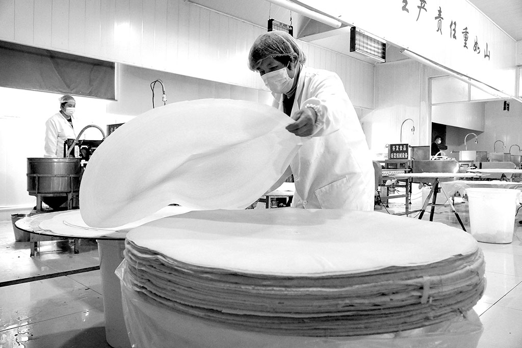 圖為新泰市樓德鎮(zhèn)村民在加工廠生產(chǎn)煎餅。徐速繪 攝