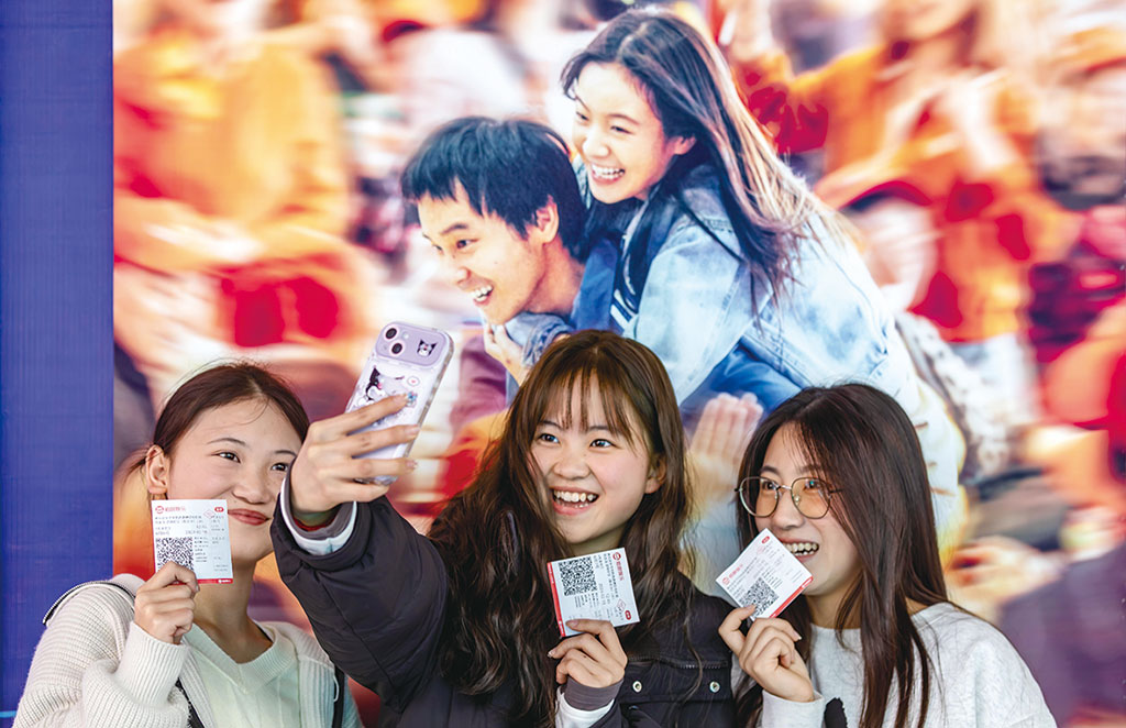 觀眾在貴州省黔西市橫店電影城電影海報前留影。范 暉 攝