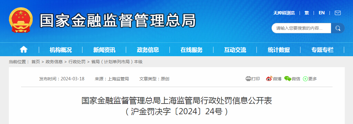 國家金融監(jiān)督管理總局上海監(jiān)管局行政處罰信息公開表