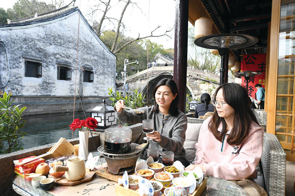 消費者在紹興市越城區倉橋直街的一家店鋪體驗“圍爐煮酒”。