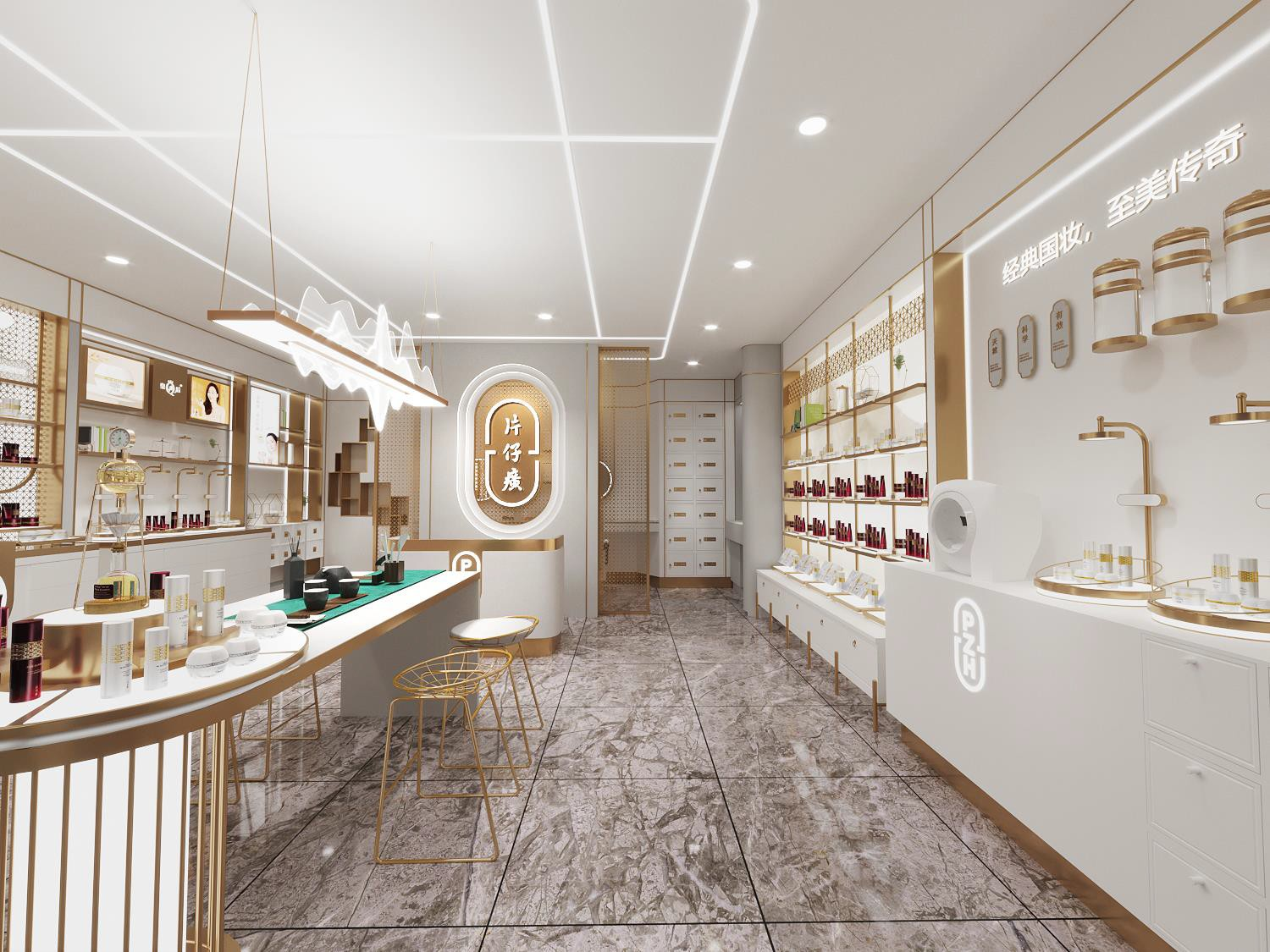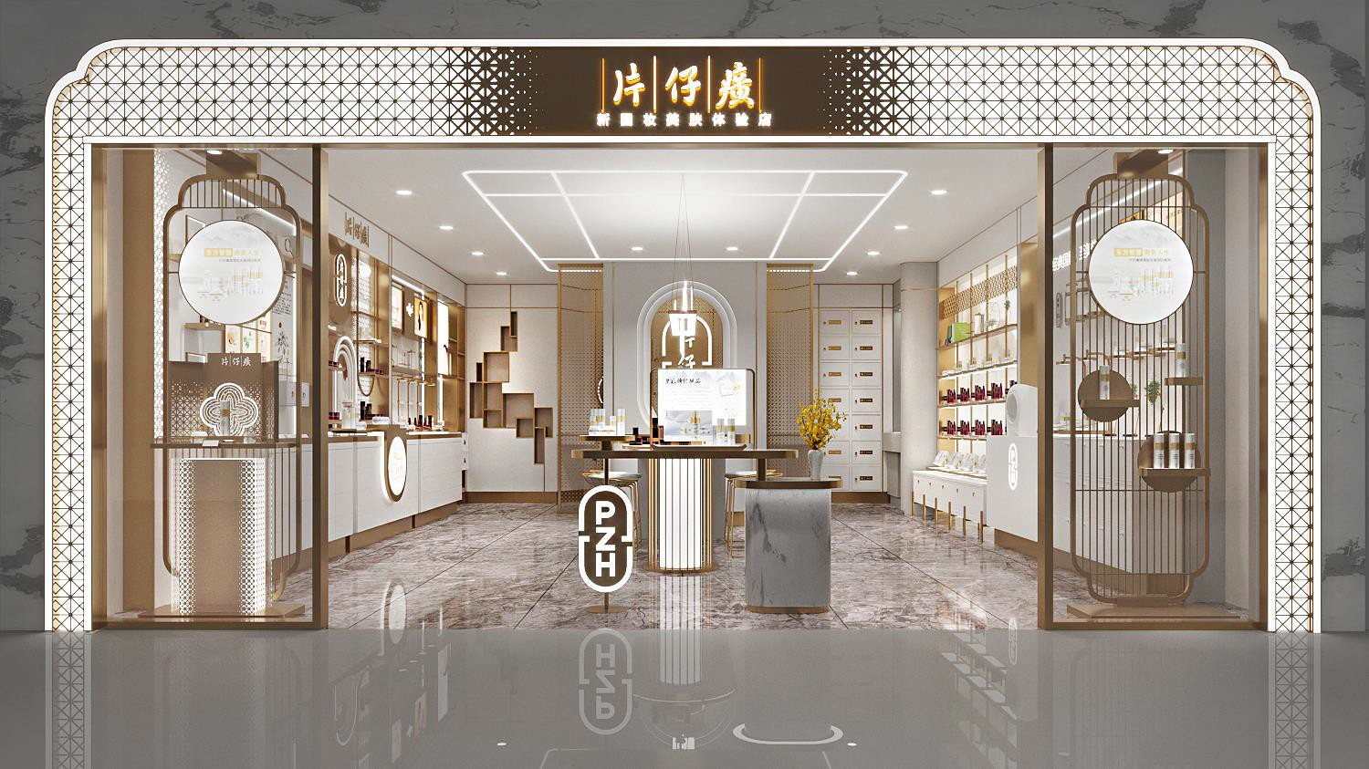 片仔癀化妝品體驗(yàn)店的“新面貌”延承并深化東方美學(xué)的視覺(jué)表達(dá),在長(zhǎng)達(dá)36次的配色糾結(jié)后,最終敲定采用中國(guó)傳統(tǒng)配色:皓白與金黃。