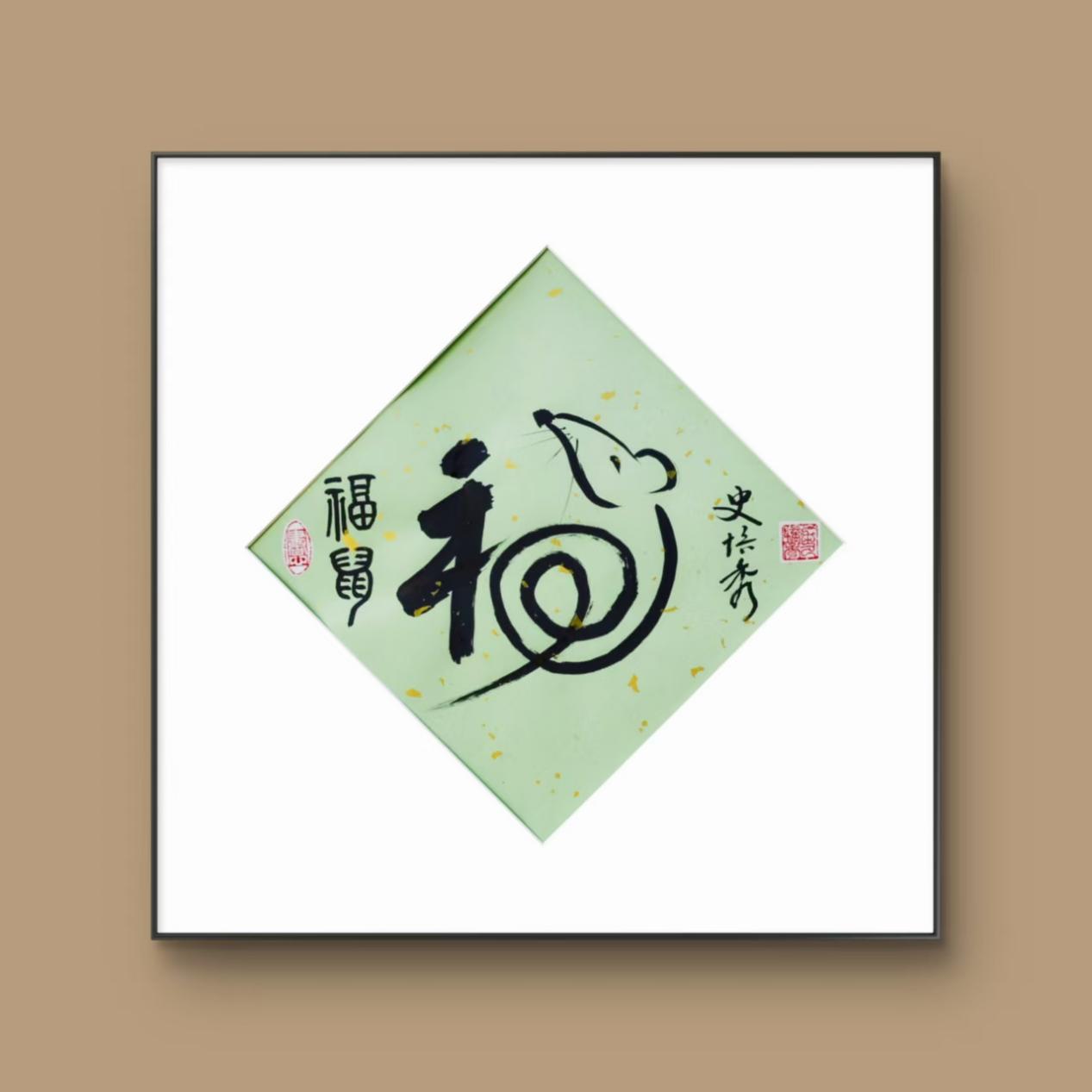 史培秀于2013年7月創建深圳市原創藝術協會,現任主席,是深圳市高層人才聯合促進會理事、深圳大學客座教授和深圳市原創藝術領軍人才。此次亮相的系列作品巧妙運用“書畫同源”的藝術理念,將傳統“福”字進行創造性重構:左側“礻”部以書法筆意書寫,筆力遒勁、氣韻生動;右側“畐”部則幻化為十二生肖的寫意形象,鼠躍、牛耕、虎嘯、兔逸……十二種神態躍然紙上,既保留漢字結構,又賦予其鮮活的生命力。十二個“福”字,十二種生肖,十二種祝福,真正實現“一人一屬相,一屬一福氣”。