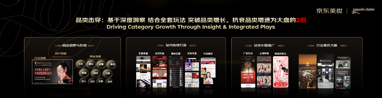 以抗衰品類為例,京東美妝攜手赫蓮娜、修麗可、蘭蔻等知名品牌,共同發起“抗衰超級品類周”,為消費者帶來價格實惠、功效顯著的抗衰好物,同時發布《抗衰趨勢洞察白皮書》,推廣科學護膚方式與理念。