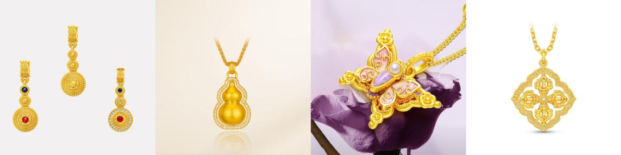 例如,周大福故宮系列百轉呈祥黃金吊墜,以故宮文物為設計靈感,定格紫禁城的華美瞬間;老鋪葫蘆鉆飾足金吊墜,采用古法手工制金工藝,葫蘆造型寓意福祿雙全,側面鑲嵌璀璨鉆石更顯精致立體;周大生心動蝶舞琺瑯黃金吊墜,從莫奈畫作中汲取靈感,通過精巧結構讓蝶翼隨風輕顫,賦予珠寶靈動生機;周大福十字金剛杵足金鑲鉆吊墜,鑲嵌82顆璀璨鉆石,既傳承東方智慧又彰顯現代審美。