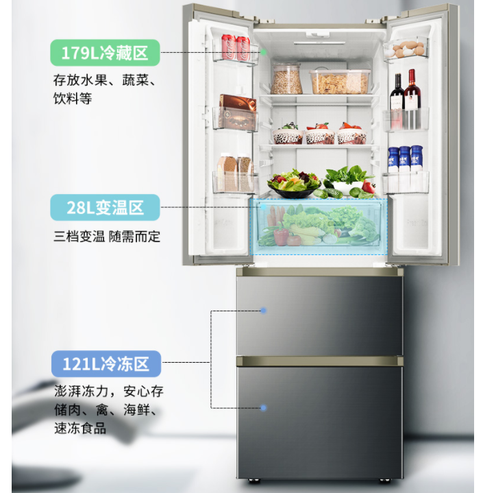如果是帶娃三口之家,對肉蛋奶蔬都有較高的保鮮需求,同時需儲存不少嬰幼兒輔食,那就需要選購一臺分儲保鮮功能更強大的冰箱。澳柯瑪的328升雙變頻法式四門風冷無霜冰箱BCD-328WPNE是不錯的選擇。首先風冷無霜免去手動除霜的煩惱,179升冷藏區、28升變溫區,對開門壁6擱架,冷藏區三層擱板,滿足嬰幼兒多種細碎輔食存儲需求,保鮮空間容量超大。