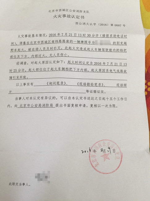 8月19日,我拿到了北京市西城區公安消防支隊的火災事故認定證明書:起火原因系電氣線路故障引發所致。我再次找到4S店要求理賠并換車,但別克廠家來人后卻推翻了4S店的說法,說不承認公安消防部門的鑒定,只承認他們承認的汽車機構的鑒定,說理賠只能給修車拒絕更換新車。