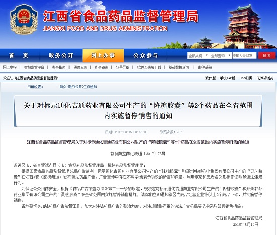 根據(jù)國家食品藥品監(jiān)督管理總局廣告監(jiān)測,標示通化吉通藥業(yè)有限公司生產(chǎn)的“降糖膠囊”和鄭州韓都藥業(yè)集團有限公司生產(chǎn)的“靈芝膠囊”在江西4套(影視頻道)發(fā)布違法藥品廣告,廣告宣傳中存在不科學地表示功效的斷言和保證、利用專家和患者名義形象作證明等違法違規(guī)行為。江西省食品藥品監(jiān)督管理局要求各地要切實加強藥品廣告監(jiān)管工作,加大對違法藥品廣告的整治力度,對違規(guī)情形嚴重的違法廣告藥品要堅決采取暫停銷售措施。