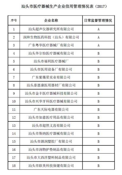 ??? 中國質(zhì)量新聞網(wǎng)訊 2018年1月10日,汕頭市食藥監(jiān)局官網(wǎng)公布汕頭市2017年度醫(yī)療器械生產(chǎn)企業(yè)質(zhì)量信用評級名單。