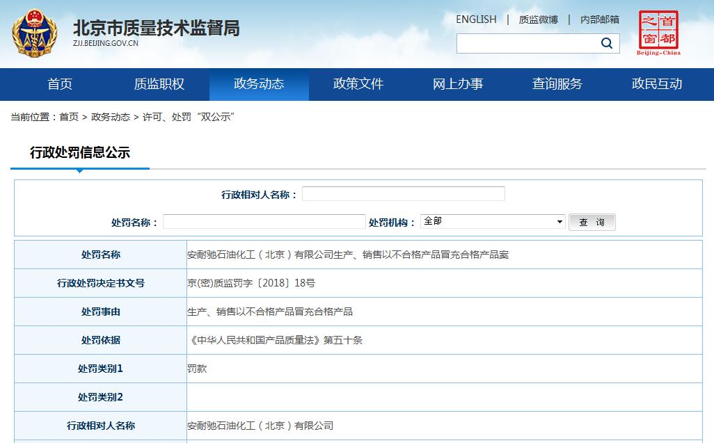 中國質量新聞網訊 據北京市質量技術監督局網站公布的京(密)質監罰字〔2018〕18號行政處罰決定書顯示,安耐馳石油化工(北京)有限公司存在生產、銷售以不合格產品冒充合格產品的違法事實,北京市密云區質量技術監督局依據《中華人民共和國產品質量法》第五十條,對該公司處以罰款。