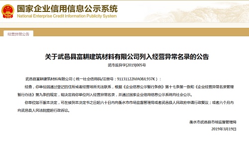 中國質量新聞網訊 近日,從國家企業信用信息公示系統獲悉,衡水市武邑縣市場監督管理局發布關于武邑縣富耕建筑材料有限公司列入經營異常名錄的公告(武市監異字[2019]005號)。