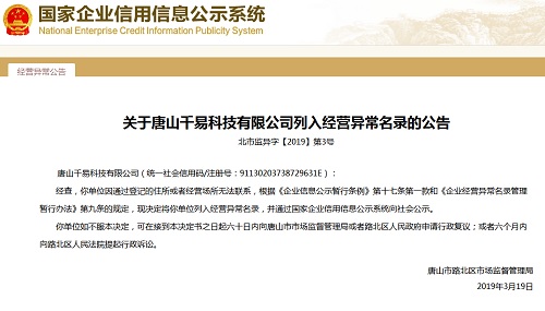 經查,唐山千易科技有限公司(統一社會信用碼/注冊號:91130203738729631E)因通過登記的住所或者經營場所無法聯系,根據《企業信息公示暫行條例》第十七條第一款和《企業經營異常名錄管理暫行辦法》第九條的規定,唐山市路北區市場監督管理局現決定將唐山千易科技有限公司列入經營異常名錄,并通過國家企業信用信息公示系統向社會公示。