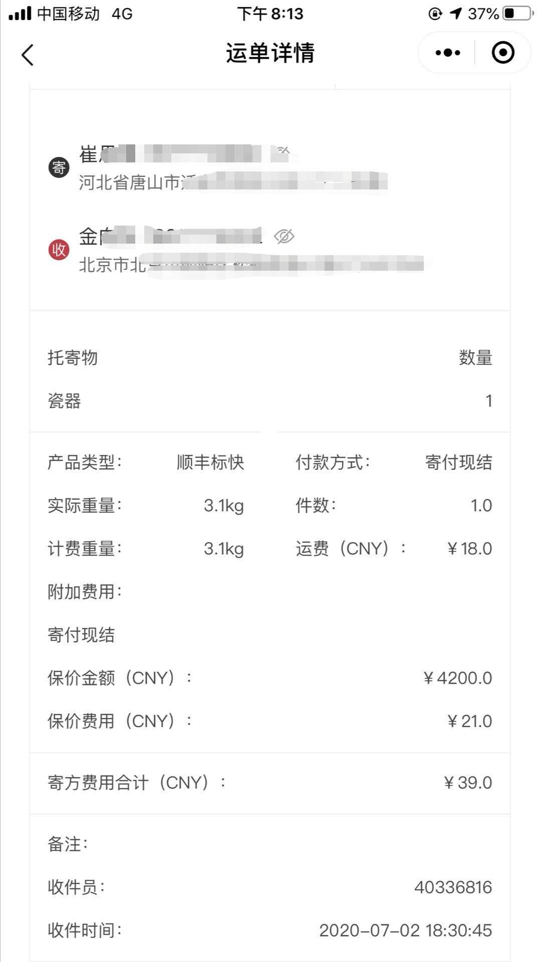 崔先生提供的電子快遞單據(jù)顯示——2020年7月2日,順豐速運(yùn)于河北省唐山市攬收了崔先生的貨品,托寄物為“瓷器”,保價(jià)金額“4200元”,保價(jià)費(fèi)用“21元”,目的地為“北京”,運(yùn)費(fèi)18元,費(fèi)用總計(jì)為39元。