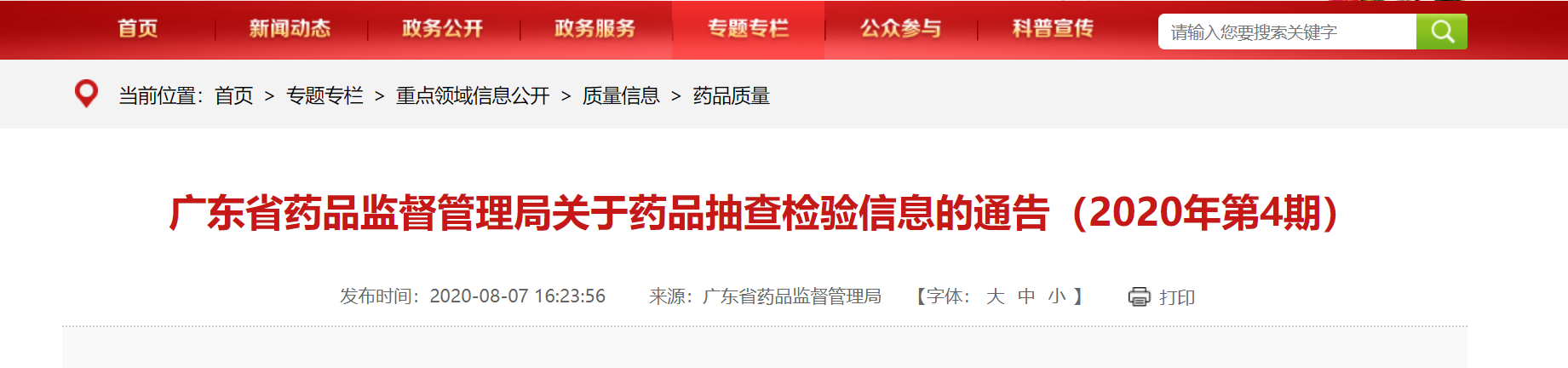 中國質量新聞網訊 8月7日,廣東省藥品監督管理局官網發布關于藥品抽查檢驗信息的通告。通告稱,為加強藥品質量監管,保障公眾用藥安全,根據2020年廣東省藥品抽檢計劃,廣東省藥品監督管理局組織對全省藥品生產、經營企業和醫療機構進行了藥品質量抽查檢驗。現將近期藥品抽樣檢驗信息通報如下: