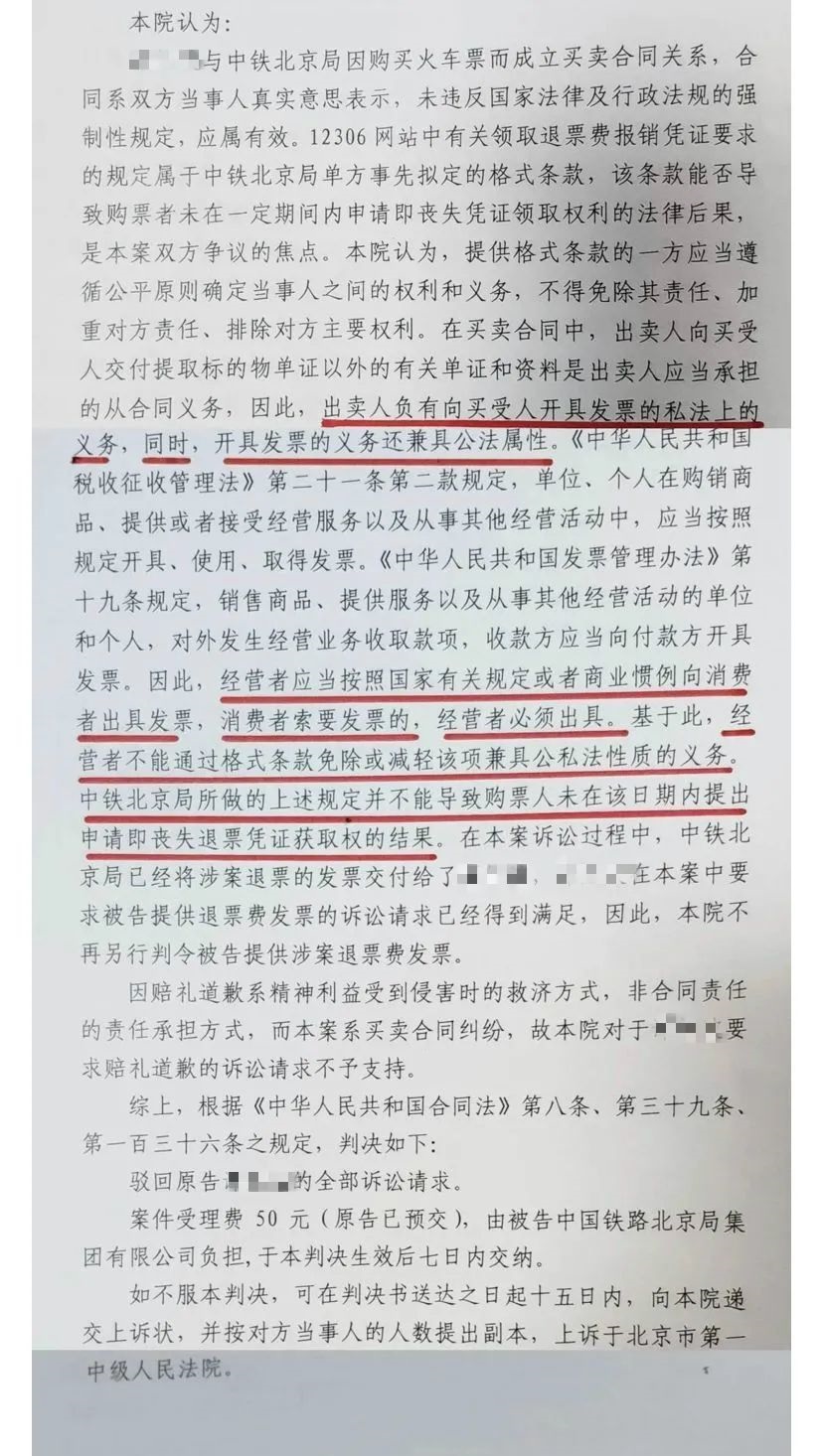 被告中鐵北京局辯稱:1. 鐵路部門在12306網站中明確告知退票后10天內應當辦理并領取退費發票。12036手機版、電腦版及退票過程中均會提示用戶在10天內領取發票;2. 公司沒有違反稅法的強制性規定,設定期限是為了更加高效的提供服務,不過多占用計算機存儲;本案系合同糾紛,賠禮道歉不是合同糾紛的責任承擔方式。綜上,請求法院駁回原告的全部訴訟請求。