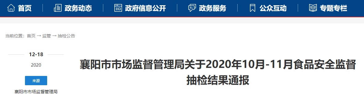 中國質量新聞網訊 (記者陳娟女) 2020年12月18日,湖北省襄陽市市場監督管理局網站通報2020年10月-11月食品安全監督抽檢結果。