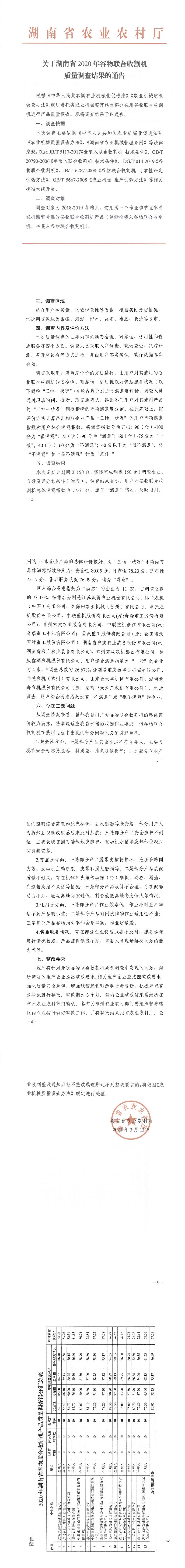 湖南省農業農村廳關于湖南省2020年谷物聯合收割機質量調查結果的通告