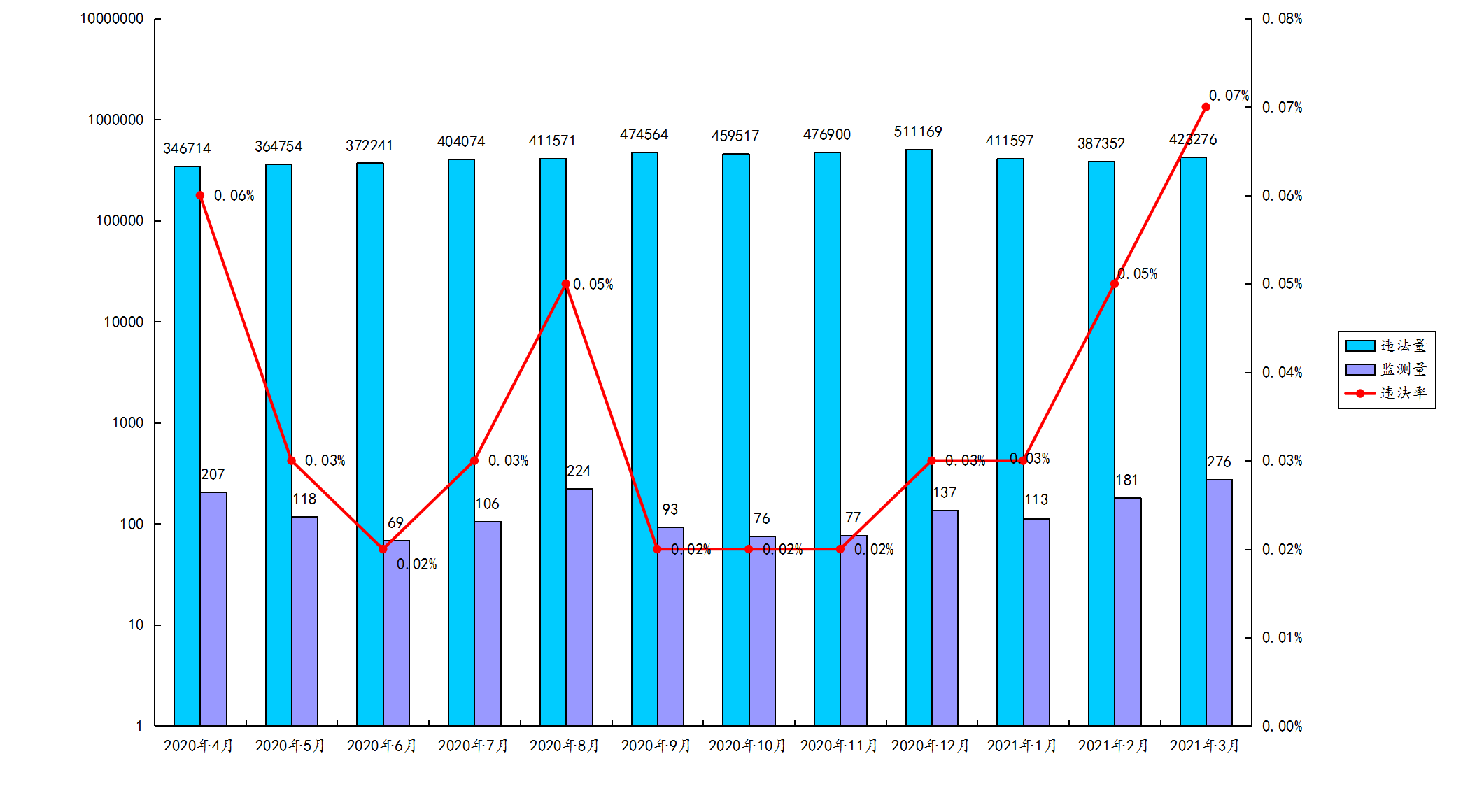 2021年3月1日至2021年3月31日,全市共監測電視、廣播、平面等傳統媒體廣告423276條次,發現涉嫌違法廣告276條次,涉嫌違法率0.07%。