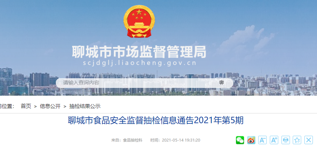 中國質量新聞網訊 山東省聊城市市場監管局網站5月14日發布食品安全監督抽檢信息通告2021年第5期。