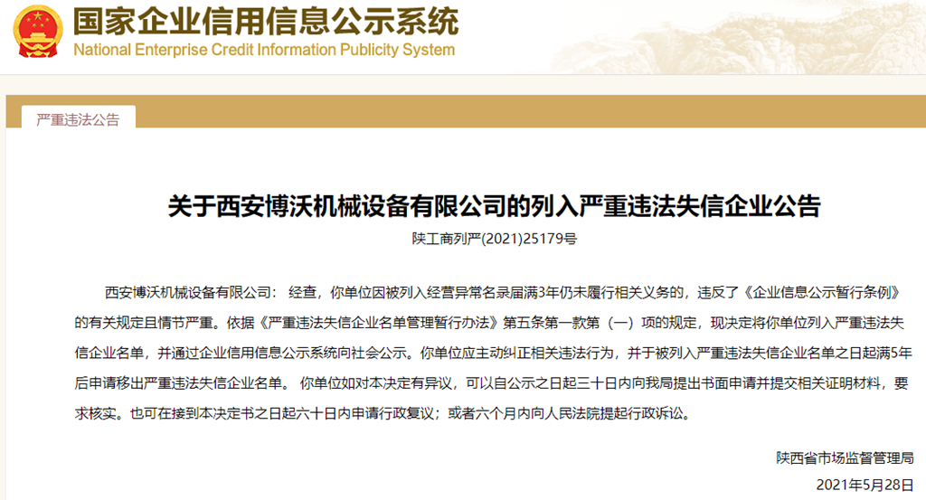 中國質量新聞網訊 從國家企業信用信息公示系統獲悉,2021年5月28日,陜西省市場監督管理局發布關于西安博沃機械設備有限公司列入嚴重違法失信企業名單的公告(陜工商列嚴(2021)25179號)。