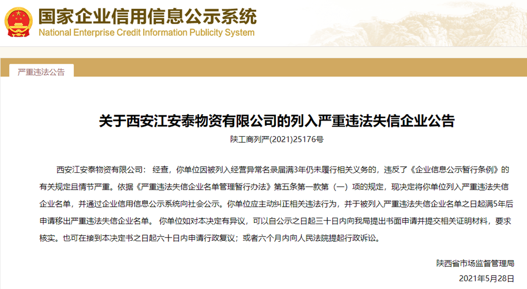 中國質(zhì)量新聞網(wǎng)訊 從國家企業(yè)信用信息公示系統(tǒng)獲悉,2021年5月28日,陜西省市場監(jiān)督管理局發(fā)布關(guān)于西安江安泰物資有限公司列入嚴(yán)重違法失信企業(yè)名單的公告(陜工商列嚴(yán)(2021)25176號)。