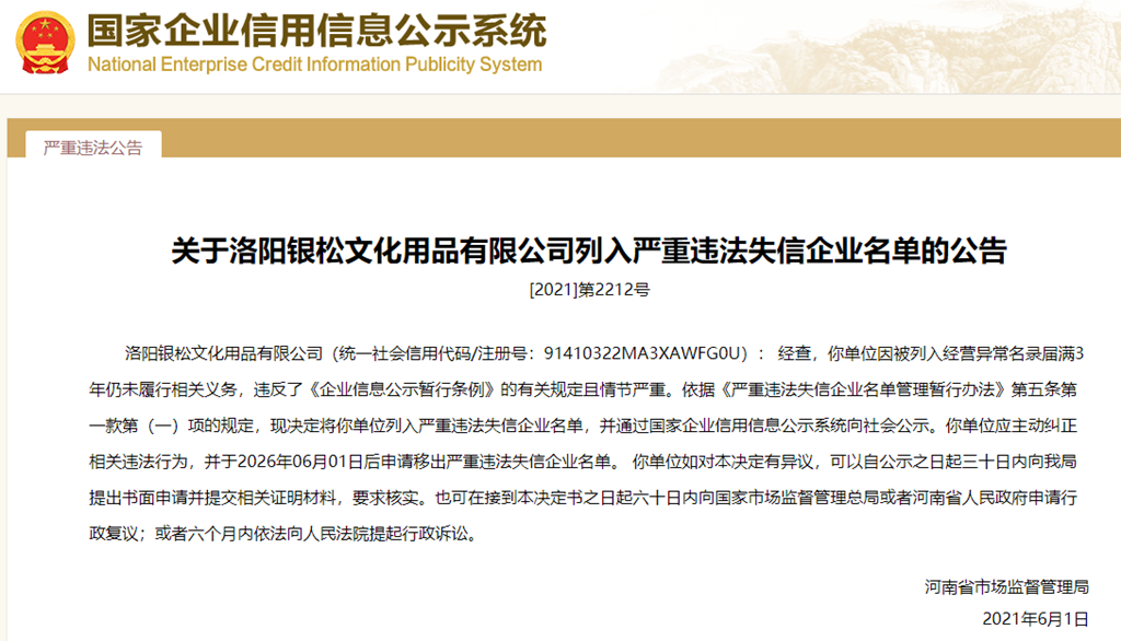 中國質(zhì)量新聞網(wǎng)訊 從國家企業(yè)信用信息公示系統(tǒng)獲悉,2021年6月1日,河南省市場(chǎng)監(jiān)督管理局發(fā)布關(guān)于洛陽銀松文化用品有限公司列入嚴(yán)重違法失信企業(yè)名單的公告([2021]第2212號(hào))。