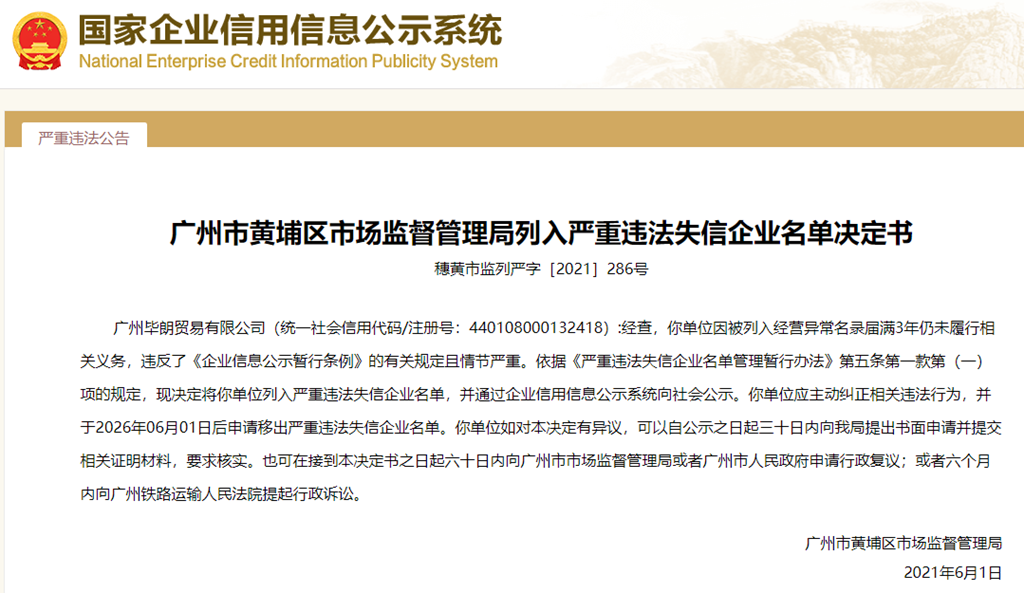 中國質量新聞網訊 從國家企業信用信息公示系統獲悉,2021年6月1日,廣州市黃埔區市場監督管理局發布關于廣州畢朗貿易有限公司列入嚴重違法失信企業名單決定書(穗黃市監列嚴字[2021]286號)。