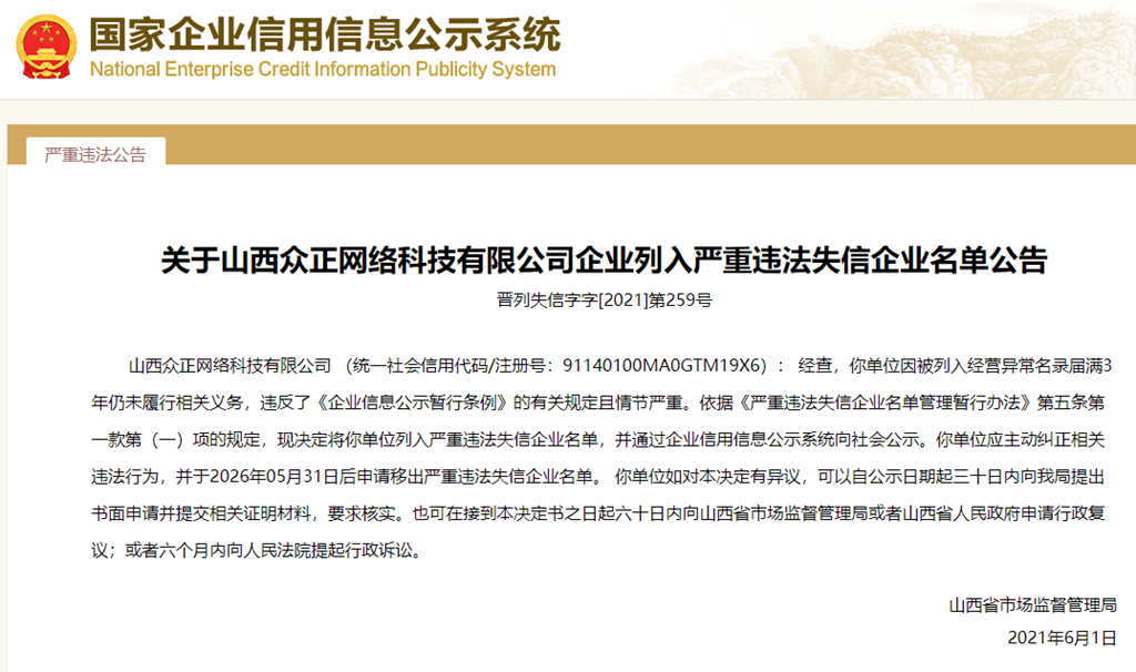 中國質量新聞網訊 從國家企業信用信息公示系統獲悉,2021年6月1日,山西省市場監督管理局發布關于山西眾正網絡科技有限公司企業列入嚴重違法失信企業名單的公告(晉列失信字字[2021]第259號)。