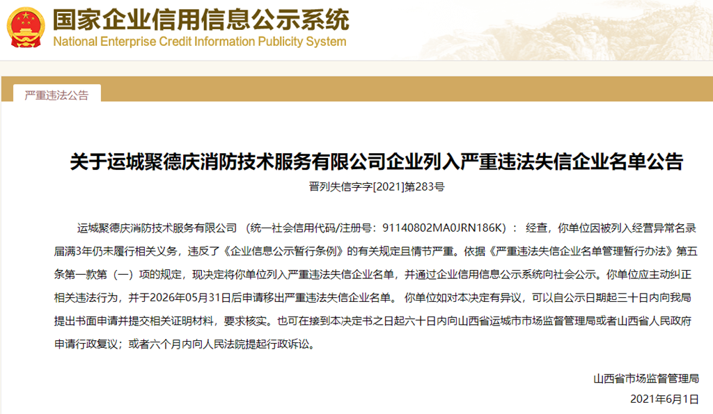 山西省市場監督管理局關于運城聚德慶消防技術服務有限公司企業列入嚴重違法失信企業名單公告