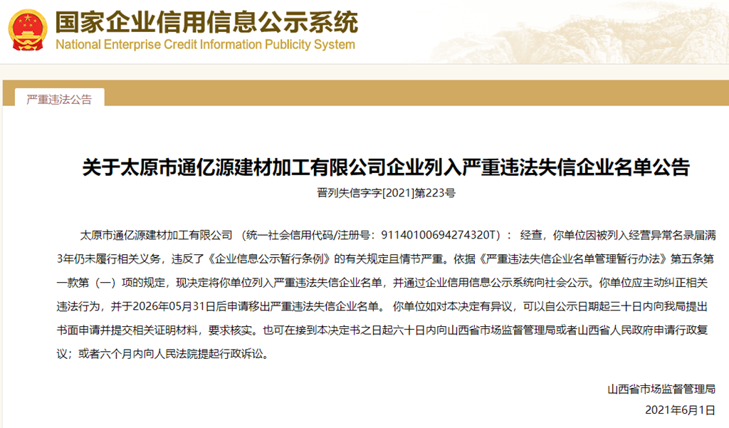 中國質量新聞網訊 從國家企業信用信息公示系統獲悉,2021年6月1日,山西省市場監督管理局發布關于太原市通億源建材加工有限公司企業列入嚴重違法失信企業名單的公告(晉列失信字字[2021]第223號)。