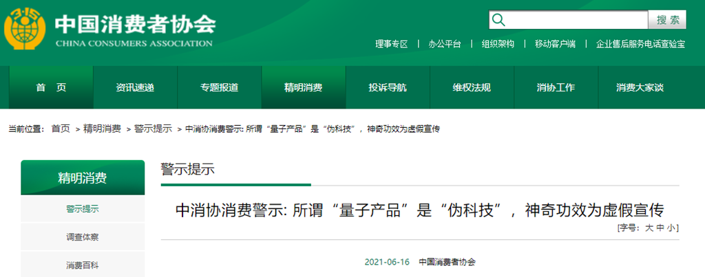 人民網(wǎng)、新華網(wǎng)、央視等媒體也曾多次就“量子產(chǎn)品”概念進行澄清。一些購買了所謂“量子產(chǎn)品”的消費者也表示使用后并沒有宣稱的效果。如,河南省三門峽市澠池縣消費者王先生2021年2月花300元購買了一個氫量子泡腳盆,宣稱可以排出身體毒素,但是使用后卻沒有任何效果,最后在澠池縣消協(xié)的調(diào)解下進行了退貨。又如,上海市消費者楊先生2018年花4萬元購買了一款量子床墊,商家宣稱該床墊可以治療腰痛,但楊先生用了一段時間之后,發(fā)現(xiàn)并沒有效果,最后只得向市場監(jiān)管部門進行舉報。