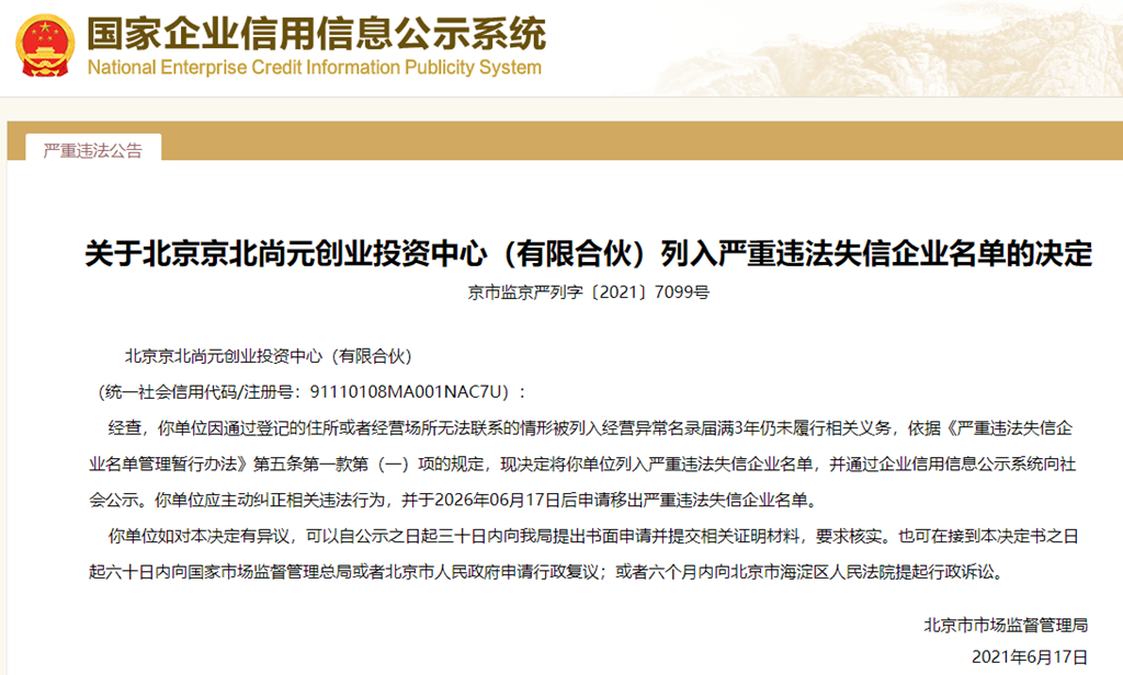 中國質量新聞網訊 從國家企業信用信息公示系統獲悉,2021年6月17日,北京市市場監督管理局發布關于北京京北尚元創業投資中心(有限合伙)列入嚴重違法失信企業名單的決定(京市監京嚴列字〔2021〕7099號)。