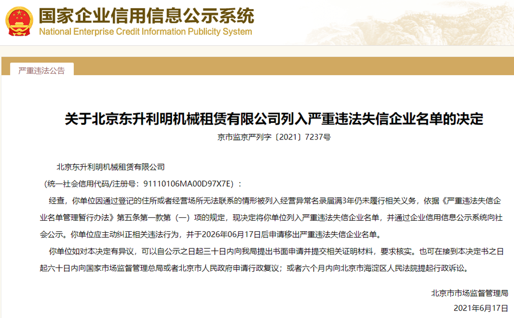 中國質量新聞網訊 從國家企業信用信息公示系統獲悉,2021年6月17日,北京市市場監督管理局發布關于北京東升利明機械租賃有限公司列入嚴重違法失信企業名單的決定(京市監京嚴列字〔2021〕7237號)。