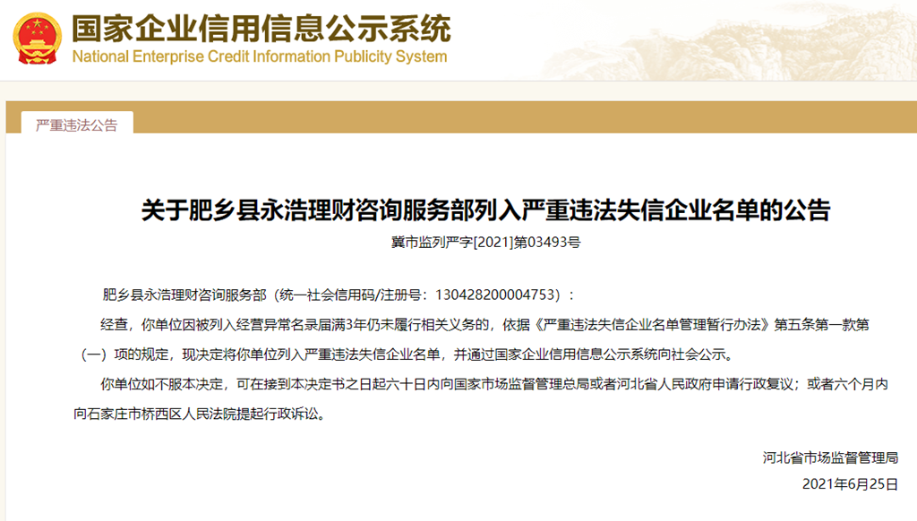中國質量新聞網訊 從國家企業信用信息公示系統獲悉,2021年6月25日,河北省市場監督管理局發布關于肥鄉縣永浩理財咨詢服務部列入嚴重違法失信企業名單的公告(冀市監列嚴字[2021]第03493號)。