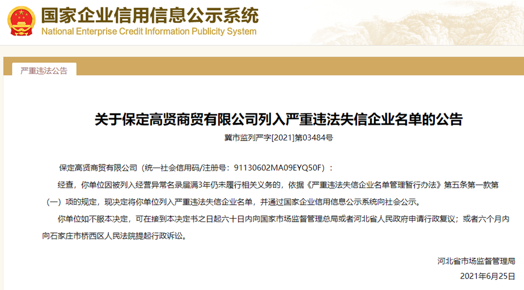 中國質量新聞網訊 從國家企業信用信息公示系統獲悉,2021年6月25日,河北省市場監督管理局發布關于保定高賢商貿有限公司列入嚴重違法失信企業名單的公告(冀市監列嚴字[2021]第03484號)。