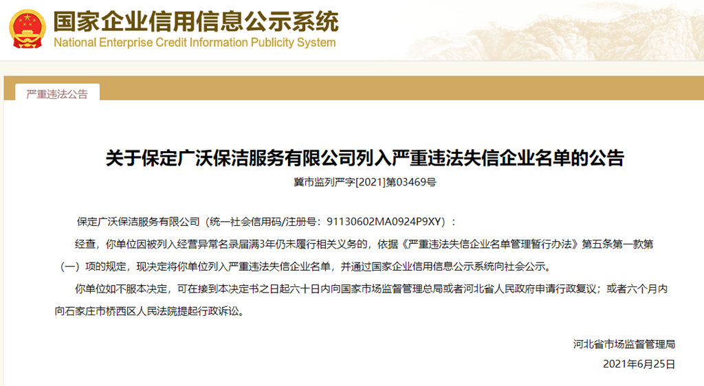 中國質量新聞網訊 從國家企業信用信息公示系統獲悉,2021年6月25日,河北省市場監督管理局發布關于保定廣沃保潔服務有限公司列入嚴重違法失信企業名單的公告(冀市監列嚴字[2021]第03469號)。