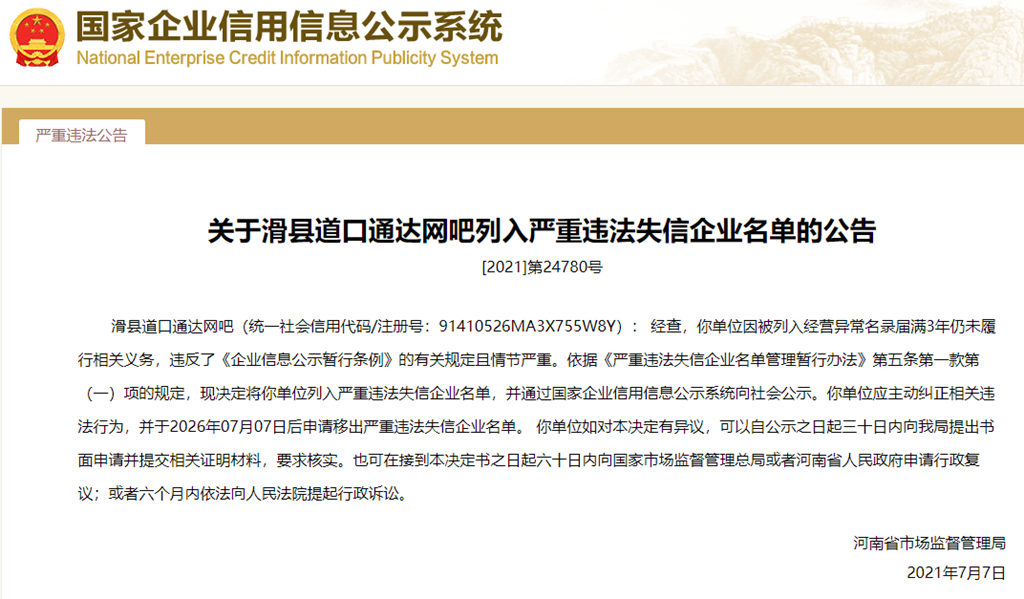 中國質量新聞網訊 從國家企業信用信息公示系統獲悉,2021年7月7日,河南省市場監督管理局發布關于滑縣道口通達網吧列入嚴重違法失信企業名單公告([2021]第24780號)。